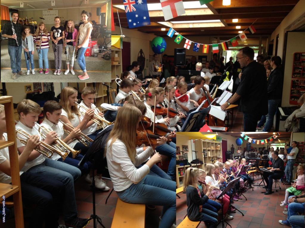 Das Vororchester Great Job trug mit fetziger Rock- und Popmusik zum Brasilienfest des Nikolauskindergartens am Sonntag bei. Nach dem Motto, selbst in der kleinsten Hütte ist Platz genug, bauten die Orchesterkinder ihre Instrumente im Eingangsbereich des Kindergartens auf um dem regnerischen Wetter auszuweichen. Denn es wäre schade gewesen diesen Auftritt wegen des Regens abzusagen. Quasi als Vorband traten die Blockflötenkinder des Jugendorchesters auf. Alle Beteiligten ernteten viel Lob.