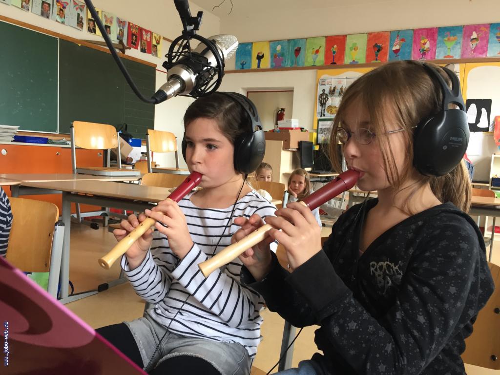 Nach einer intensiven Probenphase hat Orchesterleiter Thomas Blanke die Mikrophone aufgestellt, den Computer angeschlossen und die ersten Probeaufnahmen mit den Kindern gemacht.