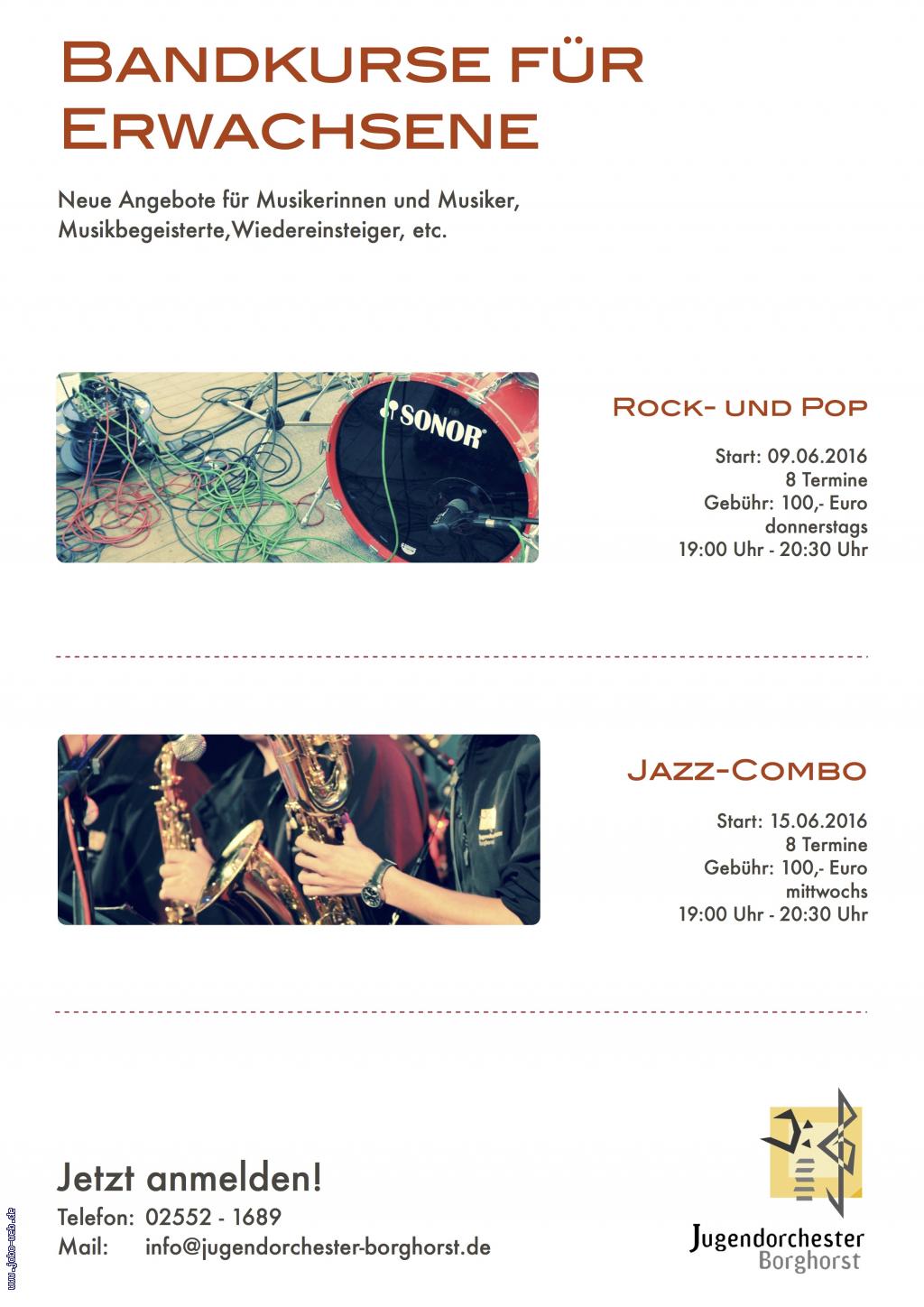 Bei uns starten kurzfristig zwei Projekte für Erwachsene: Die Rock- und Popband unter der Leitung von Alexander Cordts jeweils donnerstags von 19:00 Uhr bis 20:30 Uhr. Starttermin ist Donnerstag, der 09.06.2016.