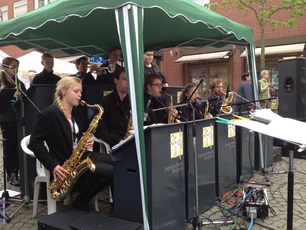 Gut gewappnet gegen den drohenden Regen, dicht zusammengerückt unter Bühne und Pavillion haben unsere Musiker der Big Band auf dem Leinenmarkt in Burgsteinfurt wieder ihr Bestes gegeben. Mara und Jonas waren bester Stimme. Volare, Straighten up and fly right, Route 66 waren einige ihrer Highlights. Dem Publikum hat es super gefallen. Thomas konnte sogar noch eine Zugabe abliefern, dann hieß es schnell zusammenpacken. Der Regen hatte uns nicht erwischt!